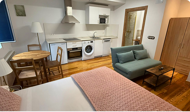 Estudio para dos personas. Cama grande, salón cocina totalmente equipada, todo en la misma estancia y baño en habitación a parte.
