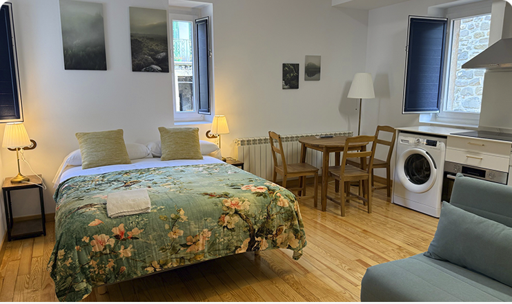 En Pirineo Apartamentos contamos con cinco estudios modernos y acogedores, ideales para parejas que desean disfrutar de una escapada en Isaba, en pleno Pirineo Navarro. Cada estudio está diseñado para ofrecer una experiencia cómoda y práctica, con todo lo necesario para tu descanso.