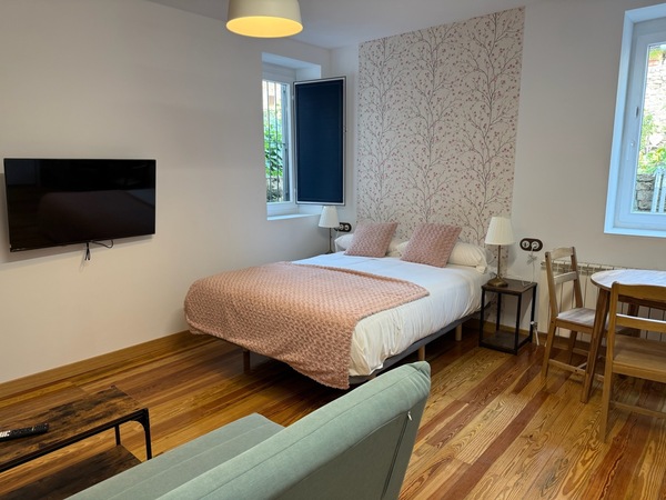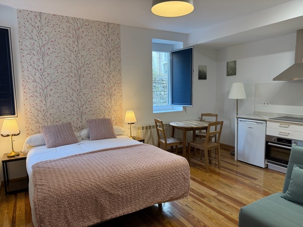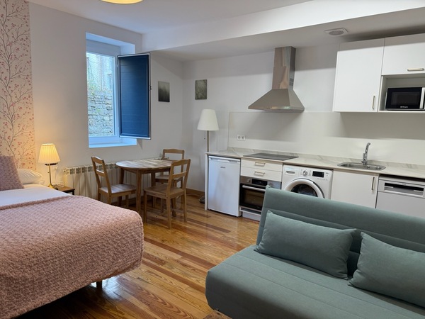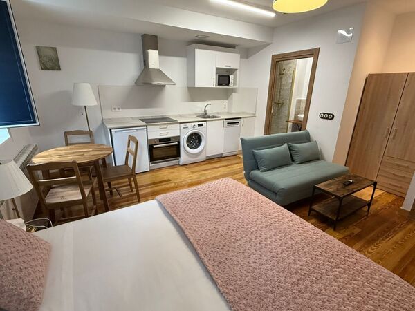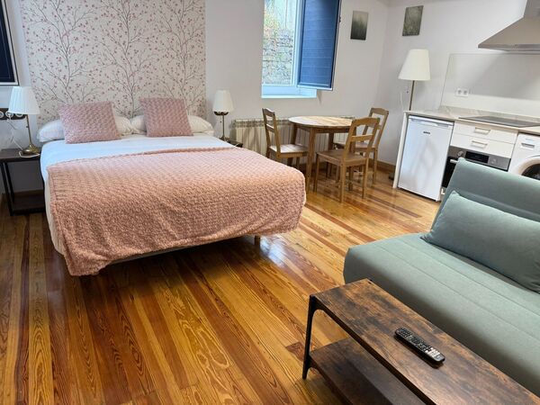 Estudio para dos personas. Cama grande de 1,50 X 2,00 salón cocina totalmente equipada, todo en la misma estancia y baño en habitación a parte.