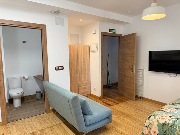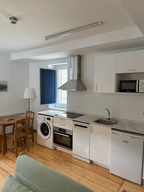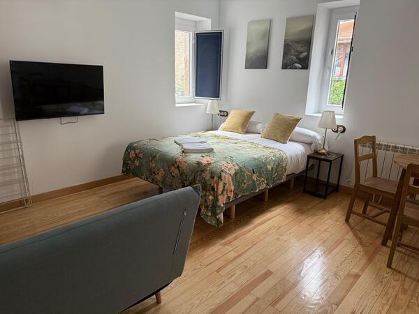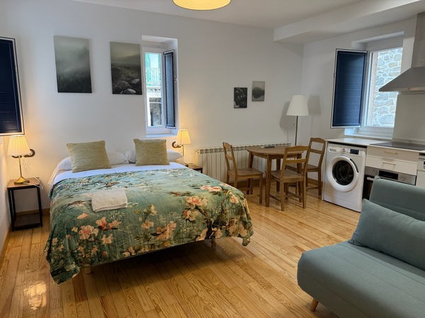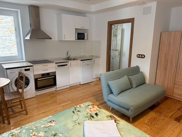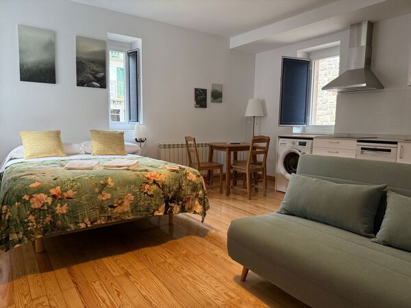 Estudio para dos personas. Cama grande de 1,50 X 2,00 salón cocina totalmente equipada, todo en la misma estancia y baño en habitación a parte.